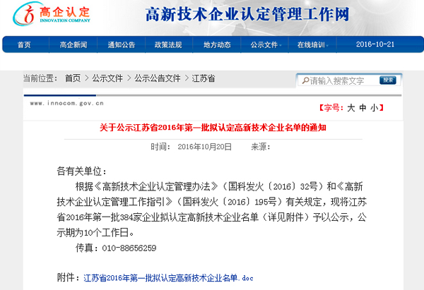 作者:南京科進 瀏覽:195 發(fā)布時間:2016/10/24 11:49:162016年10月21日,江蘇省2016年度首批認(rèn)定的高新技術(shù)企業(yè)名單公布(見附件309號),包括南京科進實業(yè)有限公司在內(nèi)的384家企業(yè)榜上有名。