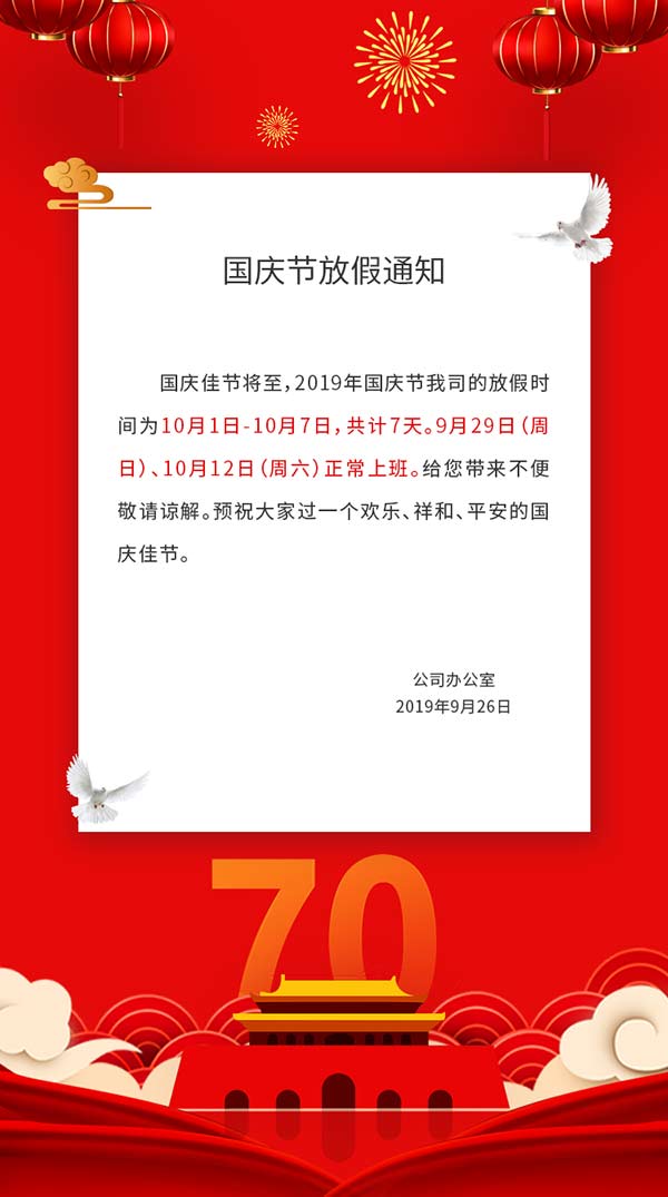 南京科進2019國慶節(jié)放假通知